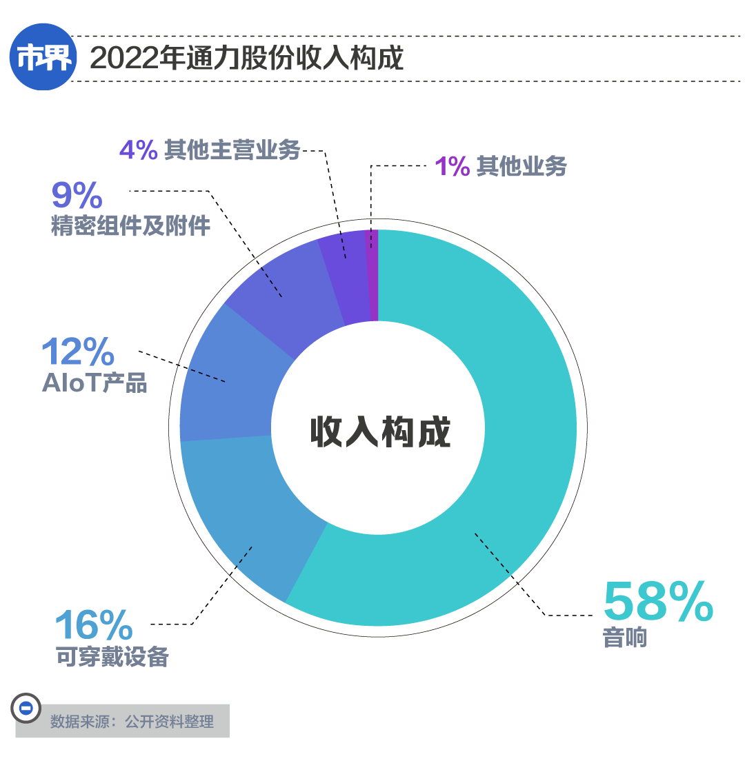 业务构成来看,2022年通力股份总收入100.31亿元中,有58%由音箱业务贡献,另外可穿戴设备、AIoT产品和精密组件及附件分别贡献了16%、12%和9%的营业收入。