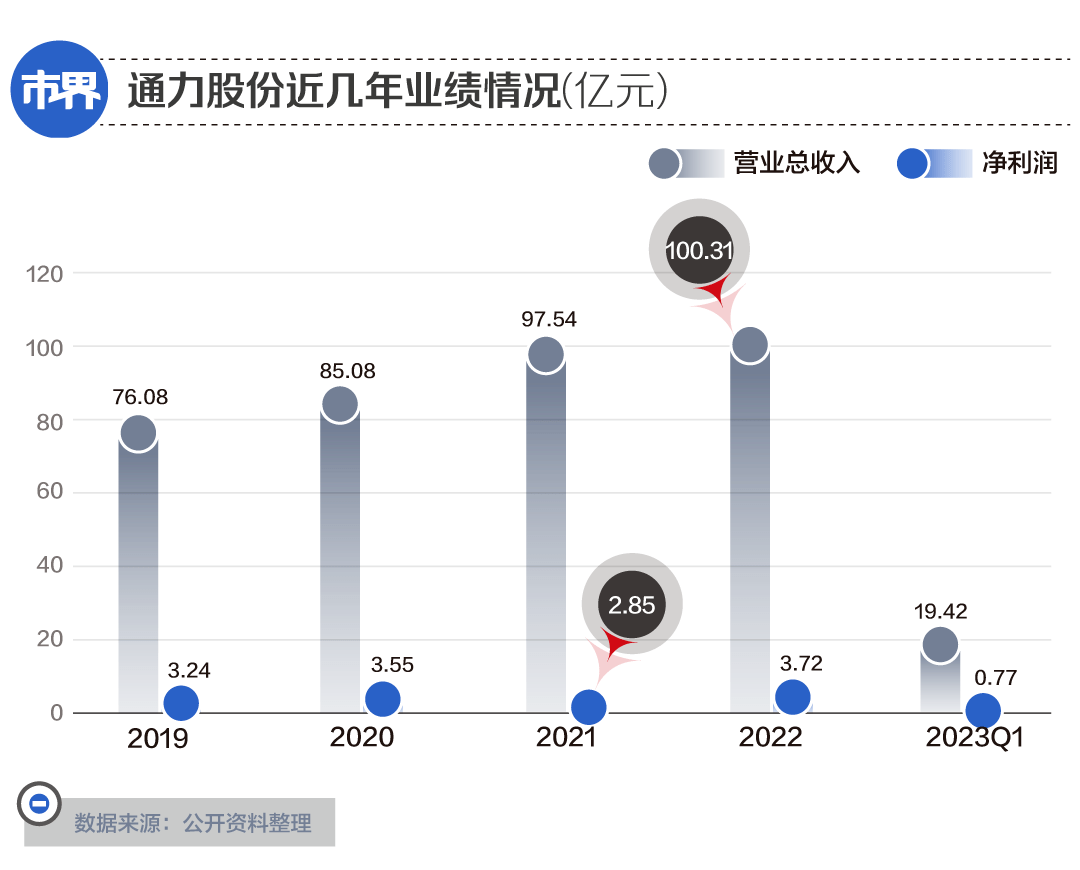2019年以来,通力股份收入从76.08亿元增至2022年的100.31亿元,净利润一直徘徊在3亿元左右,2023年一季度首次出现营业收入同比减少13.63%的情况,招股书解释主要是受消费电子市场环境所影响,同期其净利润同比大增53.16%,则主要是美元汇率等非经常性损益导致。
