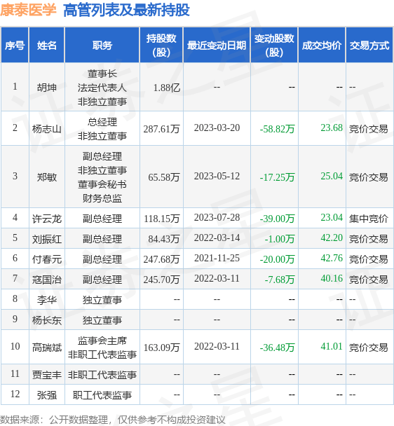 康泰医学的高管列表及最新持股情况如下: