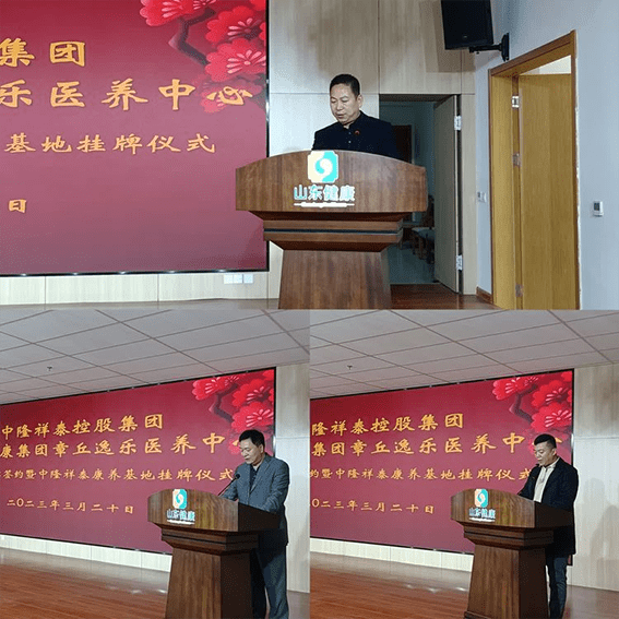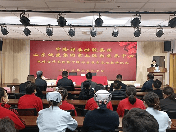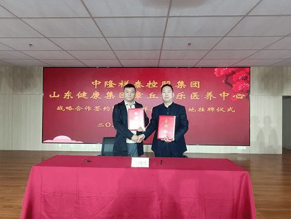 3月20日,山东健康章丘逸乐医养中心与中隆祥泰控股集团战略合作签约暨“康养基地”揭牌仪式在逸乐医养中心举行。本着 “合作共建,互利共赢”的宗旨,满足所属老年人“老有所养、老有所乐、老有所医、老有所学”养老需求。章丘区民政局副处级领导杨士俊、中隆祥泰集团董事长、总裁夏邑猛、山东健康章丘逸乐医养中心党支部书记、院长张延东及相关部门负责人、代表参加活动,共同见证这一重要的时刻。