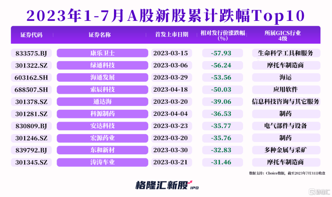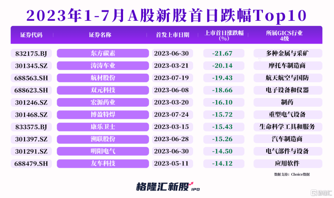 此外,7月共有7家新股于上市首日破发,其中2家跌幅较大,分别位列今年以来首日跌幅榜第三、第六。