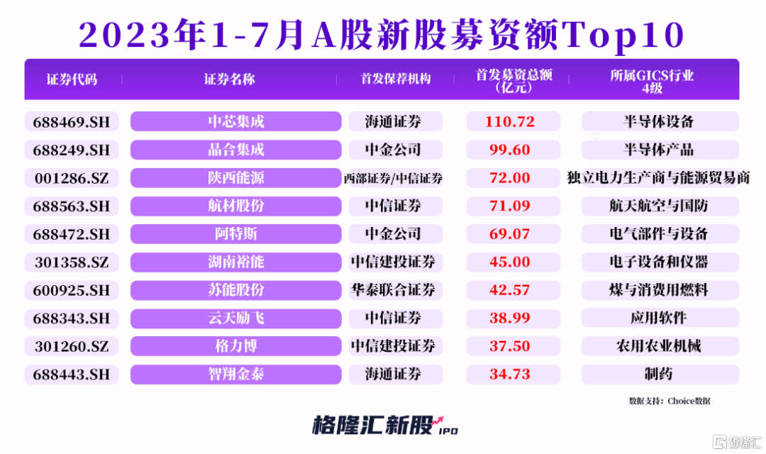 从募资板块分布来看,2023年1-7月,科创板是当之无愧的“吸金地”,募资额已累计破千亿(1044.06亿元),占A股总募资额的比例高达42%。今年前十大IPO中,科创板新股占据六席。