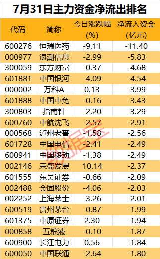 今日有15股主力资金净流出超2亿元,其中医药龙头恒瑞医药流出居首,达到11.4亿元,另外浪潮信息、东方财富、中国银河主力资金净流出均超4亿元。