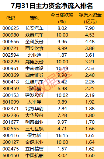 从个股看,沪深两市44股主力资金流入超1亿元。长安汽车、众泰汽车分别获主力抢筹7.9亿元、4.53亿元,金科股份、西安饮食、比亚迪、鸿博股份也获主力抢筹超3亿元。