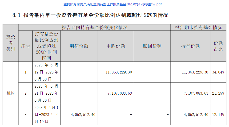 银柿财经注意到,益民服务领先灵活配置基金所吸引到的 大额申购主要来自两笔机构资金,均在6月19日之后、即在该基金“躺平”之后买入,申购总份额达到1847万份。