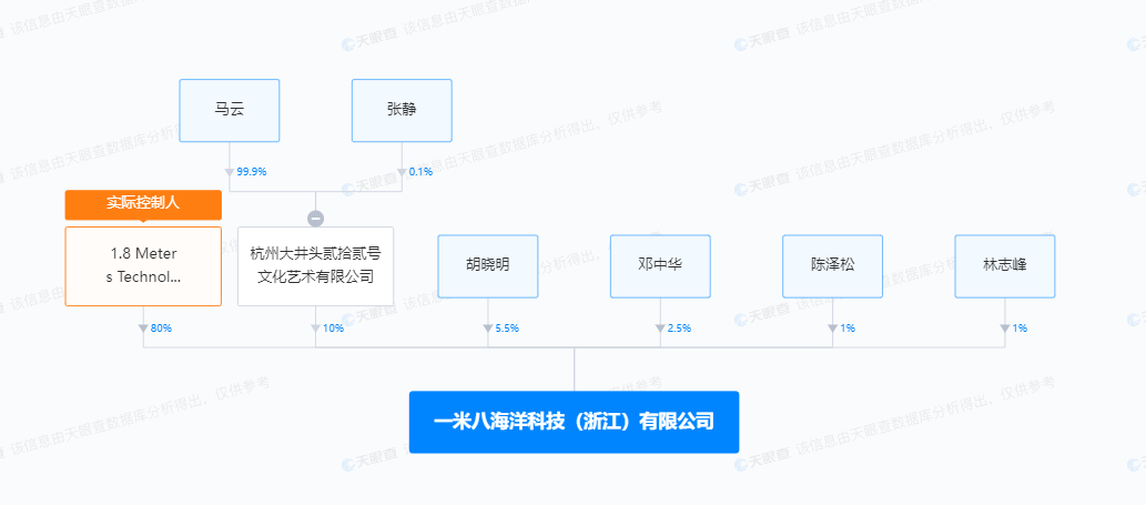股权穿透信息显示,一米八海洋科技(浙江)有限公司目前有六位股东,其中,1.8 Meters Technology Holding Limited为实际控制人,持比股例为80%;第二大股东杭州大井头贰拾贰号文化艺术有限公司,持股比例为10%,而马云持有该公司高达99%的股权。因此,一米八海洋科技(浙江)被认为是马云的新投资动向。