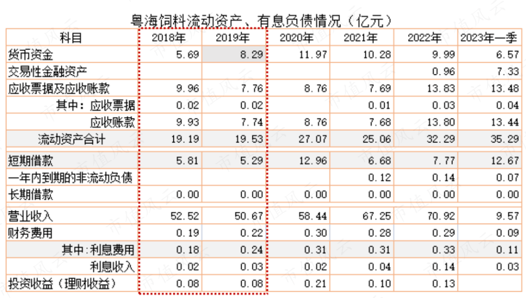 讨论粤海饲料应收账款的一个具体问题,2019年营业收入比2018年下降3.5%,应收账款同比下降22%;到了期末,流动资产反而增加0.34亿元,主要是货币资金较2018年末增加2.6亿元。