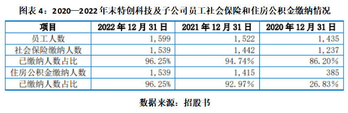 报告期之前,特创科技社保公积金缴纳比例更低,2019年末特创科技的社会保险和住房公积金缴纳人数分别为740人、62人,占比分别为57.68%、4.83%。