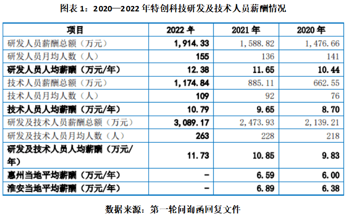 而首轮问询函回复文件显示,报告期各期,特创科技同行业可比公司研发人员的平均工资均值分别为11.63万元/年、12.39万元/年、10.41万元/年;另外,特创科技注册地和办公地所在的惠州市统计局显示,报告期内惠州当地的平均工资分别是6.00万元/年、6.59万元/年、6.83万元/年。