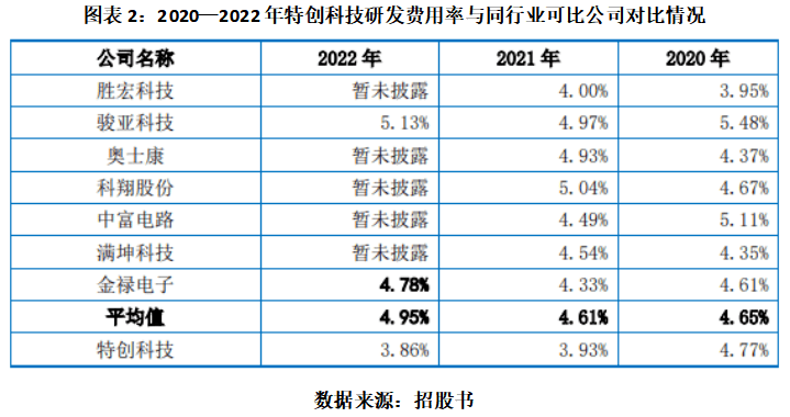 报告期各期,特创科技同行业可比公司的研发费用率平均值分别是4.65%、4.61%、4.95%,总体呈上升趋势,且对比来看,2021—2022年,特创科技的研发费用率低于同行业可比公司平均水平。