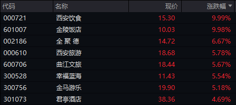 受此影响,31日旅游板块迅速走红,西安饮食、金陵饭店涨停,全聚德、西安旅游、曲江文旅、幸福蓝海、金马游乐等涨超5%。