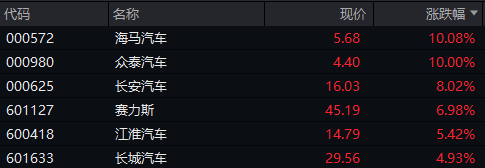 当日汽车整车、新能源整车概念纷纷大涨, 海马汽车、众泰汽车涨停,长安汽车、塞力斯、中集车辆、江淮汽车等涨超5%。
