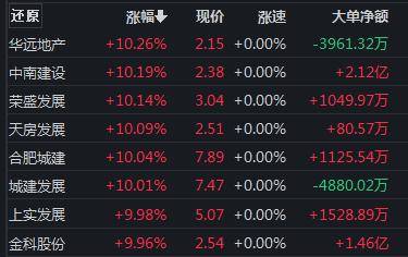 房地产开发涨幅居前,华远地产、中南建设、荣盛发展等多股涨停。