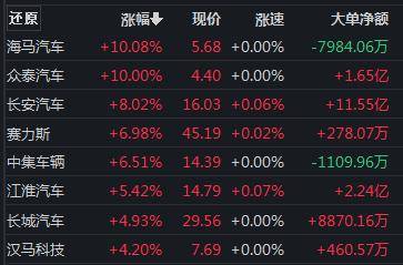 汽车整车全天领涨,众泰汽车、海马汽车双双涨停,赛力斯、长城汽车、长安汽车等纷纷跟涨。