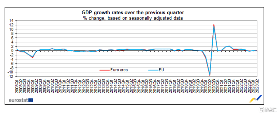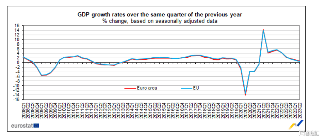 与上一年同季度相比,2023年第二季度欧元区经季节性调整的国内生产总值增长0.6%,欧盟增长0.5%,上一季度欧元区和欧盟均增长1.1%。