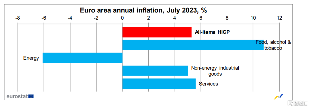 从欧元区通胀的主要构成来看,预计7月食品、烟酒的年化通胀率最高(10.8%,6月份为11.6%),其次是服务业(5.6%,6月份为5.4%)、非能源工业品(5.0%,6月份为5.5%)和能源(6.1%,6月份为5.6%)。