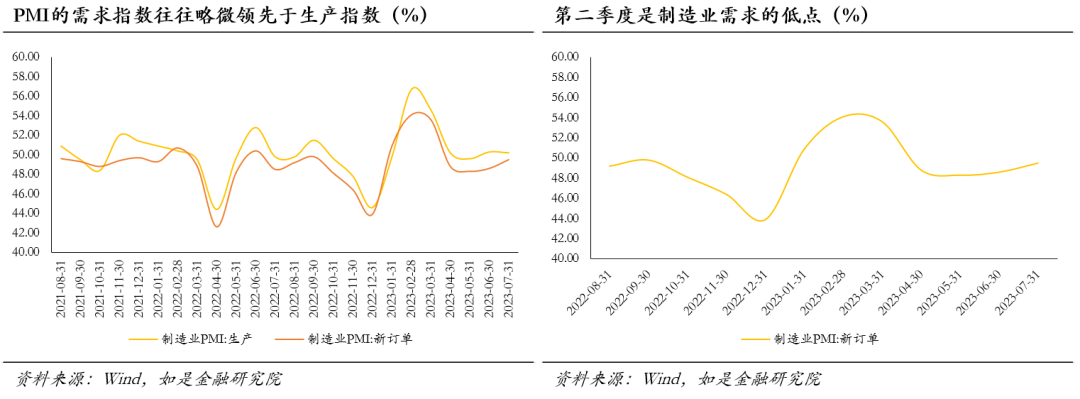 生产端:在50%基准线附近波动。7月制造业PMI生产指数为50.2%,较上月50.3%回落了0.1pct。自二季度起PMI生产指数整体在50%基准线附近波动,体现的是生产端的波澜不惊,本月生产端指数也仍在50%之上。但如果结合供求两端看,PMI需求指数的变动往往会领先生产指数1-2个月,背后的逻辑是制造业企业的生产往往是由需求所驱动的。从今年的数据看,在年初疫情达峰制造业恢复正常后,4月到6月是一个短期的工业需求低点,因此未来两个月才是观察生产指数是否下滑的重要时间节点。