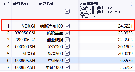 从下图可以看到,在主要的宽基指数里,涨的最好的是纳斯达克100,涨幅为24.62%。