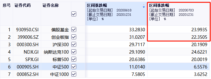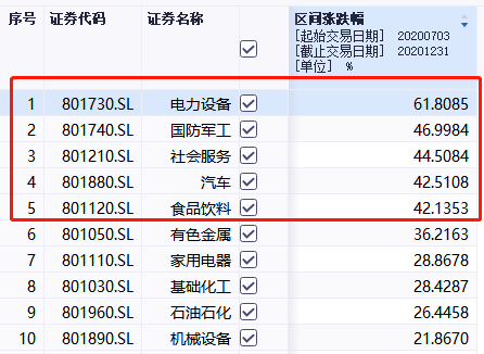 数据显示,在2020年7月3日到2020年底,申万一级行业来看,涨幅最大行业是电力设备,主要是新能源,其次是国防军工、社会服务、汽车和食品饮料,涨幅均在42%以上。
