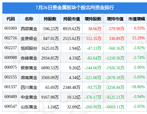 北向资金方面,当日贵金属板块北向资金持股市值为63.46亿元,减持1.95亿元。其中增持最多的是西部黄金,增持了579.99万元。减持持最多的是山东黄金,减持了0.67亿元。贵金属板块北向资金持股变动明细见下表: