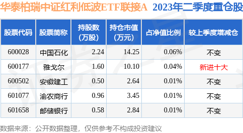 华泰柏瑞中证红利低波ETF联接A为指数型-股票基金,根据最新一期基金季报显示,该基金资产配置:股票占净值比0.14%,无债券类资产,现金占净值比6.54%。基金十大重仓股如下: