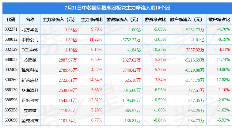 从资金流向上来看,当日中芯国际概念股板块主力资金净流入1.76亿元,游资资金净流出3.24亿元,散户资金净流入1.48亿元。中芯国际概念股板块个股资金流向见下表: