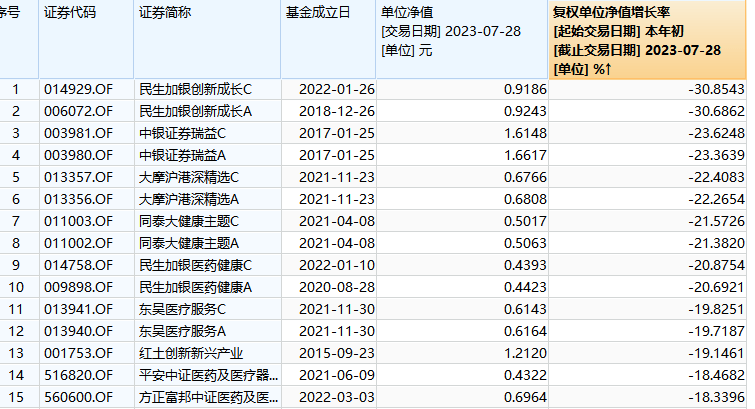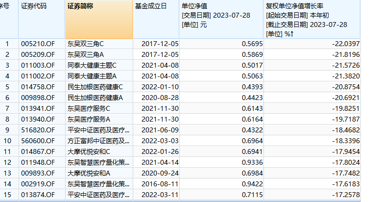 医疗保健主题基金中,东吴双三角基金、同泰大健康主题基金、民生加银医药健康主题基金同期跌幅都超过20%。