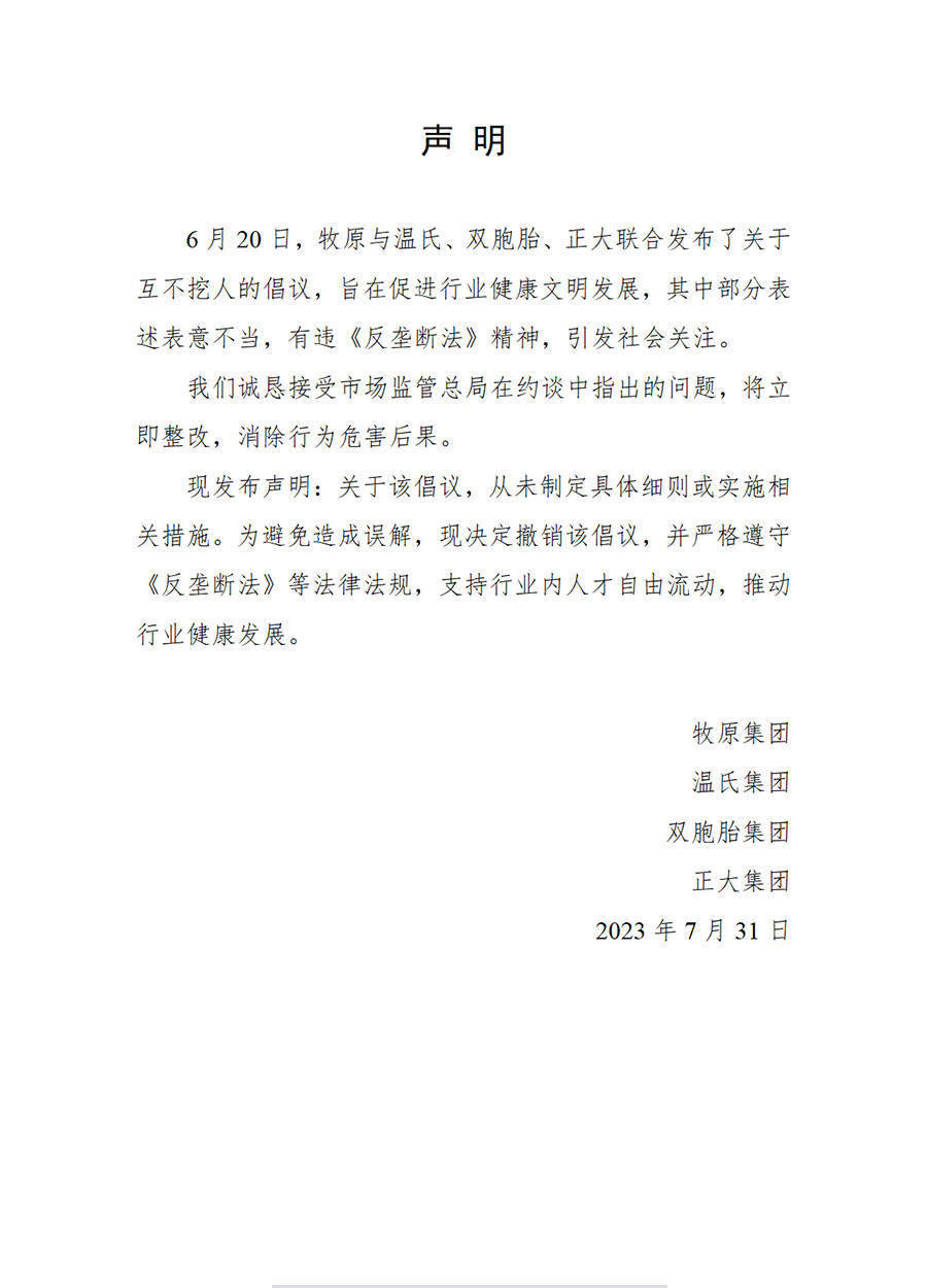 7月31日,牧原集团、牧原集团、温氏集团、双胞胎集团、正大集团联合发布声明表示,诚恳接受市场监管总局在约谈中指出的问题,将立即整改,消除行为危害后果。