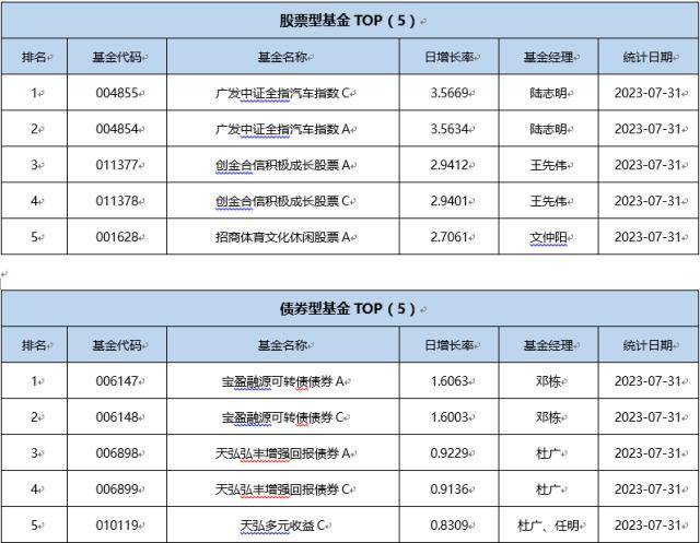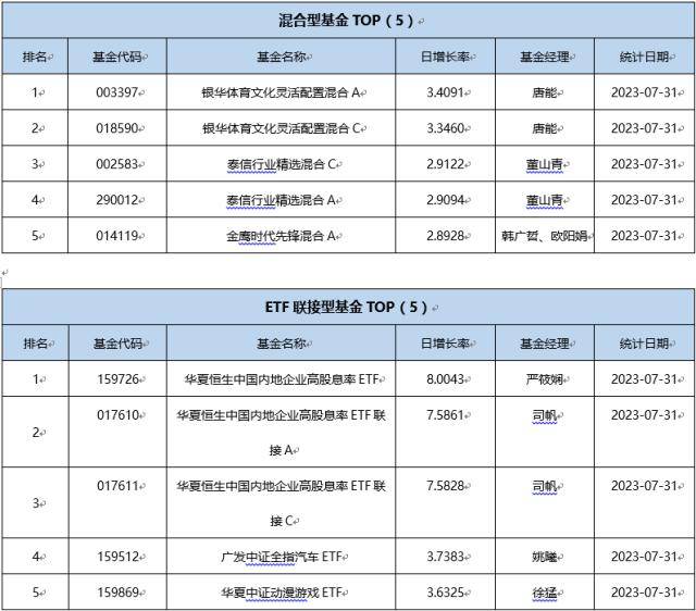 单基金方面,剔除掉 创新封基类型 基金的影响,7月31日业绩表现最好的基金为华夏恒生中国内地企业高股息率ETF,日增长率为8.0043 %,其次为华夏恒生中国内地企业高股息率ETF联接A,日增长率为7.5861 %、华夏恒生中国内地企业高股息率ETF联接C,日增长率为7.5828 %。