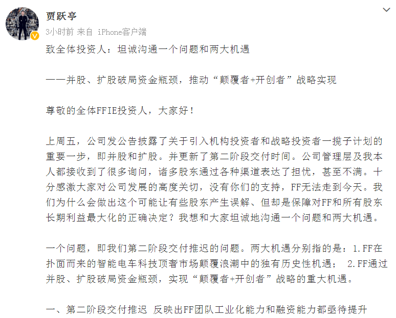6月21日,贾跃亭在微博发长文就法拉第未来首款车型第二阶段交付推迟致歉,称此次交付推迟的几个更深层次的系统性原因,即FF团队的工业化能力不足和融资能力不足。