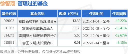 徐智翔先生:中国国籍,研究生、硕士,自2012年10月至2013年04月任华彩咨询集团咨询顾问;2013年05月至2015年05月任上海空间电源研究所(航天811所)投资主管;2015年06月至2017年06月任浙商证券股份有限公司行业研究员;2017年06月至2021年10月任平安资产管理有限责任公司投资经理;2021年10月加入富国基金管理有限公司。2021年11月4日任富国新材料新能源混合型证券投资基金基金经理。2022年2月9日任富国长期成长混合型证券投资基金基金经理。