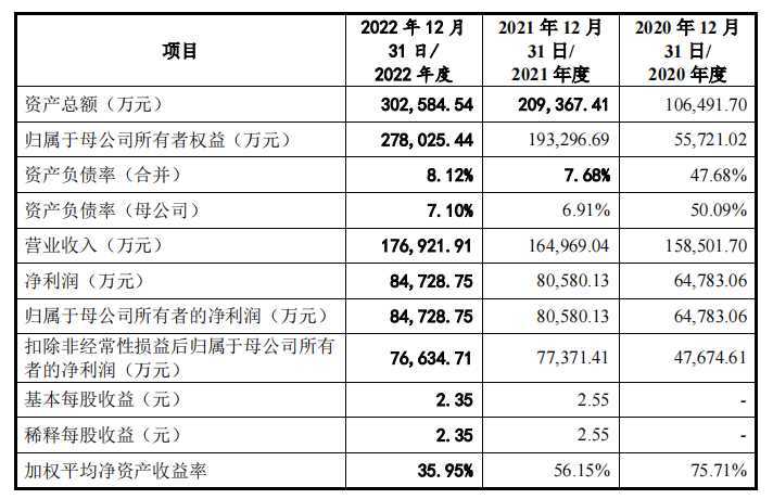 从盈利能力来看,根据敷尔佳公布的《招股说明书(上会稿)》(下称“招股书”)数据显示,2020年-2022年,敷尔佳的营收分别为15.85亿元、16.50亿元和17.69亿元,净利润分别为6.48亿元、8.06亿元和8.47亿元,扣非后净利润分别为4.77亿元、7.74亿元和7.66亿元。