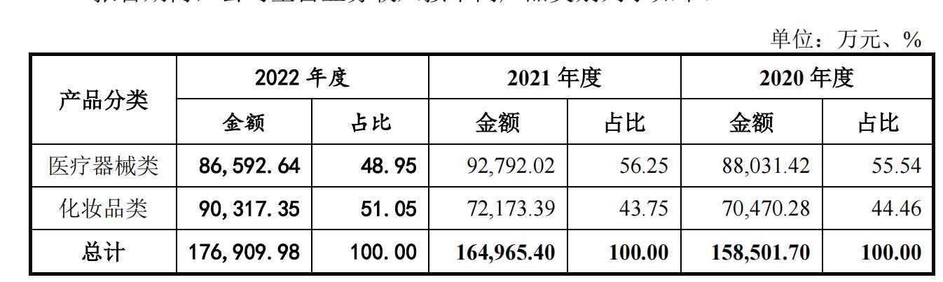 值得注意的是,据招股书显示,敷尔佳2022年化妆品类功能性护肤品销售占比为51.05%,首次超过50%,报告期内,敷尔佳化妆品类产品收入分别为7.05亿元、7.22亿元及9.03亿元,占比分别为44.46%、43.75%以及51.05%。