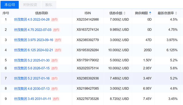 企业预警通数据显示,世茂集团目前共有美元债9只,已经全部违约,存续余额约 64.19亿美元,约为人民币458.19亿元。