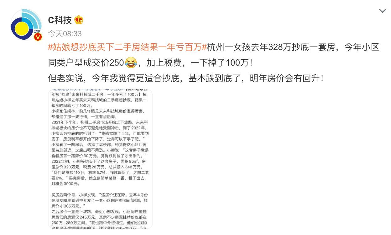 2023年8月1日,杭州的一名女子在社交平台上分享了自己买房的经历,引起了众多网友的关注。她去年在未来科技城板块买了一套二手房,本以为是在市场低谷时买入,却在一年多的时间里亏了100万元人民币。