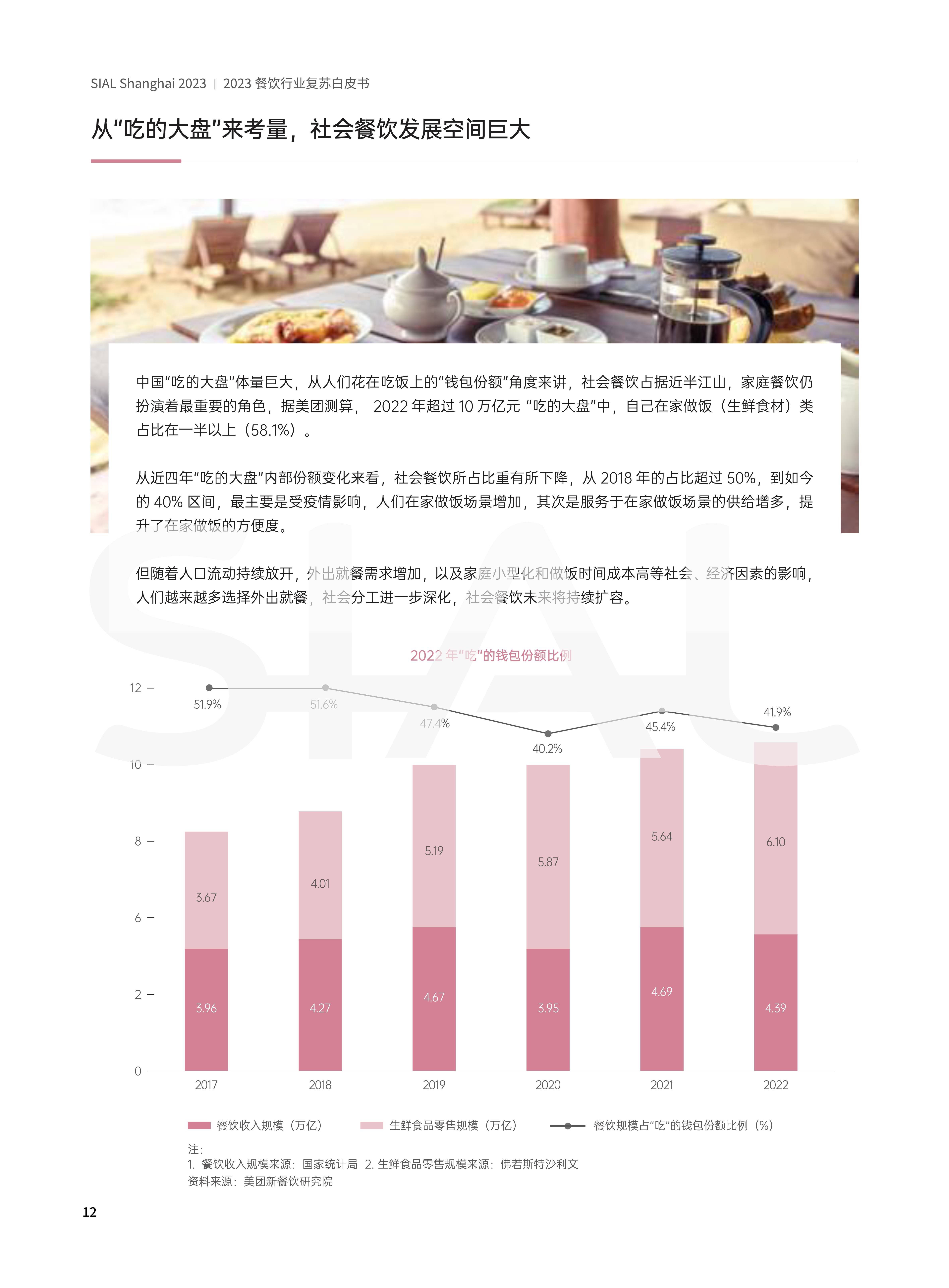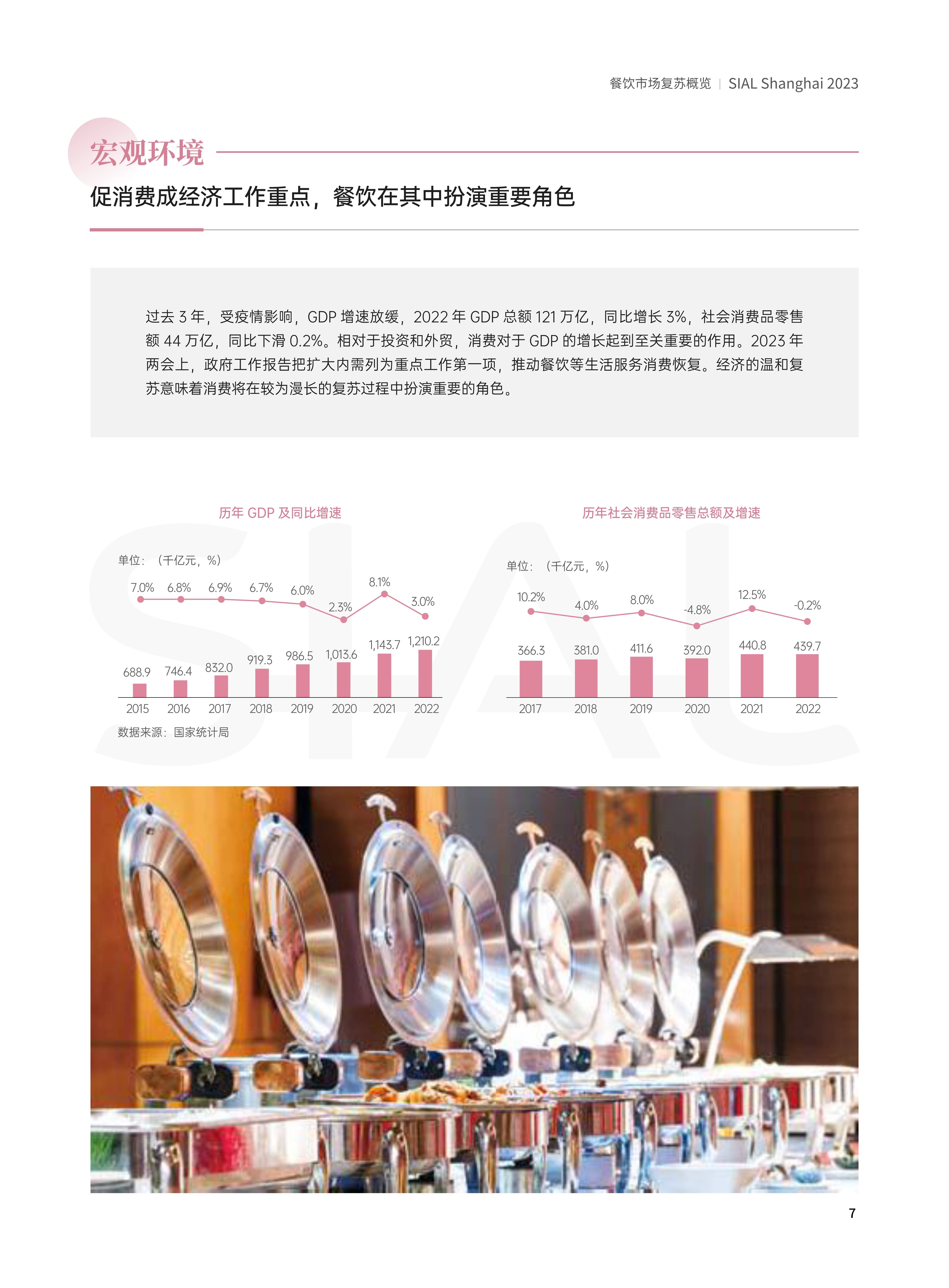 过去3年,受疫情影响,GDP增速放缓, 2022年GDP总额121万亿,同比增长3%,社会消费品零售极44万公同比下滑02%,相对于投资和外度,消要对于GDP的增长起到资关重要的作用, 2023年两会上,政府工作报告把扩大内需列为重点工作第一项,推动餐饮等生活服务消费恢复,经济的温和复苏意味着消费将在较为漫长的复苏过程中扮演重要的角色。