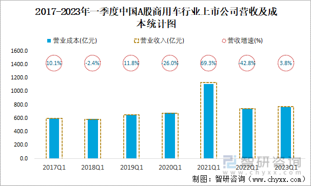 2017-2023年一季度中国A股商用车行业上市公司营收及成本统计图