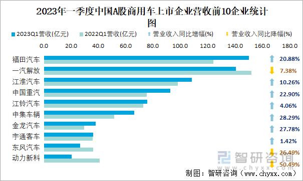 2023年一季度中国A股商用车上市企业营收前10企业统计图