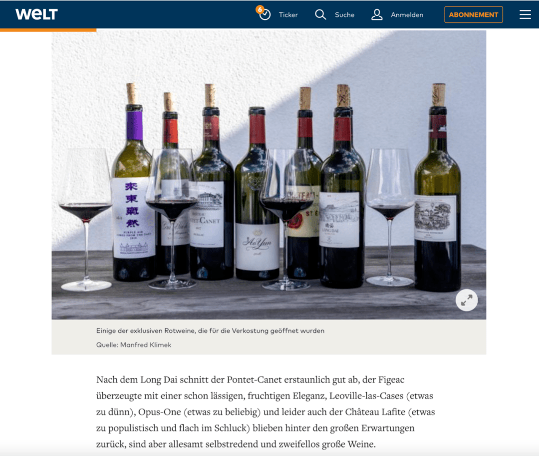 ▲德国《世界报》发表的题为《中国葡萄酒会很快超越法国葡萄酒吗?》文章:在中国酿造的红葡萄酒让一些法国顶级葡萄酒相形见绌。即使欧洲人可能不喜欢听,在葡萄酒酿造的中心世界之外,一种独立的葡萄酒文化正在兴起。我敢断言,到2030 年,世界上一些最好的红酒将来自中国人自己的酒庄,带着中国特色,由中国酿酒师自己酿造,而龙谕是第一款具有影响力的中国顶级葡萄酒,真正堪称为中国本土风味的葡萄酒。