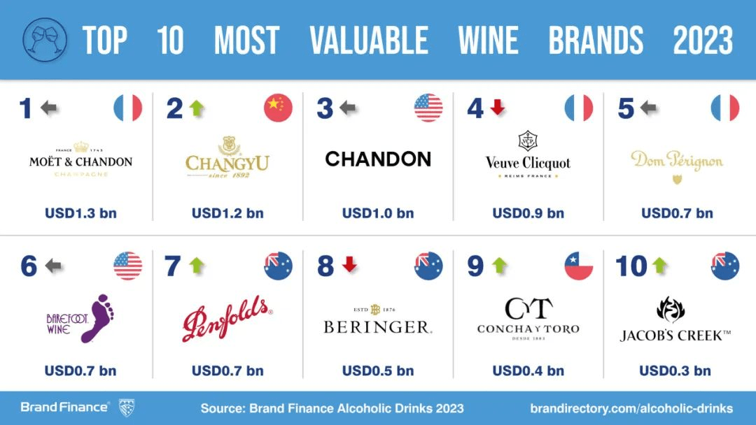 此外,Brand Finance还公布了“2023全球最具价值的葡萄酒&香槟品牌”(Most valuable Wine & Champagne brands)榜单,张裕以12亿美元的品牌价值位列全球第二。