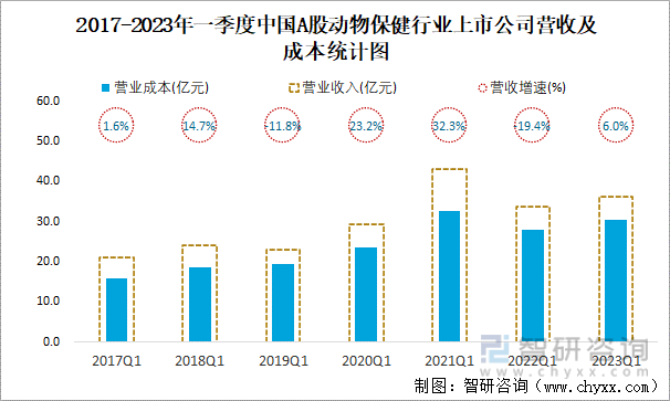 2017-2023年一季度中国A股动物保健行业上市公司营收及成本统计图