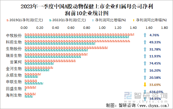 2023年一季度中国A股动物保健上市公司中,中牧股份归属母公司净利润最高,有1.4亿元,净利润增速为4.76%,净利润排名前十的企业中1家企业同比有所下滑。2023年一季度中国A股动物保健上市公司中,净利润同比增幅最大企业为回盛生物,增速为634.03%。