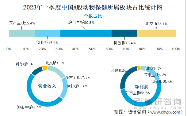 2023年一季度动物保健13家上市公司以沪市主板企业数最多,占比30.8%,营收主力为沪市主板,沪市主板净利润占比最多;总营收累计为36.14亿元,按2023年5月24日统计其上年同期营收增加了6.03%(统计时间有细微差异,13家企业上年一季度营收为34.09亿元);累计归属母公司净利润为6.2亿元,2家企业净利润出现亏损,占比总企业数的15.38%。