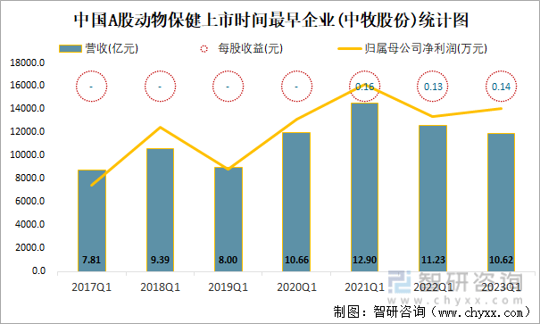 2023年一季度中国A股动物保健上市公司中,截至2023年5月24日,1999年1月7日上市的中牧股份上市时间最早,距今约24年,从近几年一季度营收与净利润来看,2021Q1营收最高,有12.9亿元。