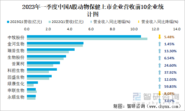2023年一季度中国A股动物保健上市企业营收前10企业统计图