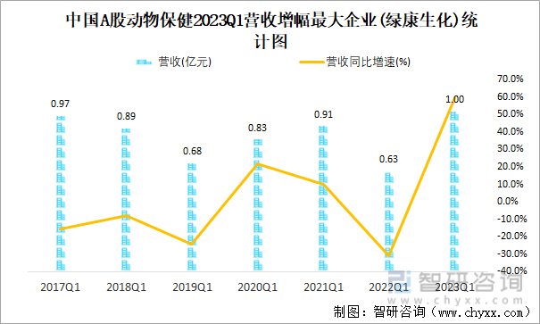 中国A股动物保健2023Q1营收增幅最大企业(绿康生化)统计图