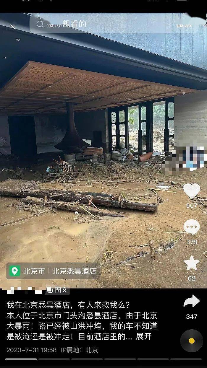 “目前酒店里的情况,没信号,没电,没热水!想回家。”7月31日晚间,一位北京悉昙酒店住客在社交平台上发布受困求救信息。由于北京持续大暴雨,酒店外的道路被山洪冲垮。根据该住客发布的视频,酒店大堂陈设已被洪水冲毁,室外多处造景也遭损毁。
