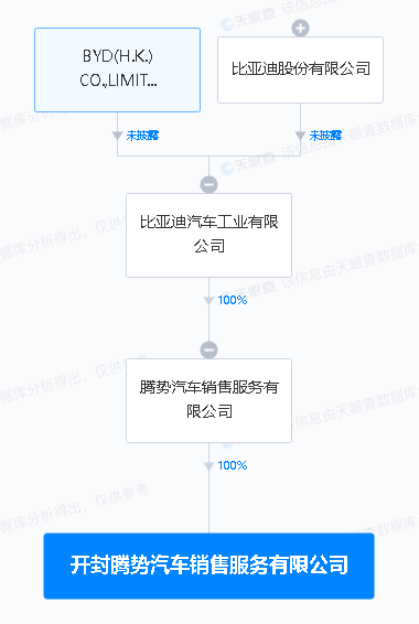 天眼查App显示,近日,开封腾势汽车销售服务有限公司成立,法定代表人为张林,注册资本100万元,经营范围含汽车销售、新能源汽车整车销售、新能源汽车电附件销售、汽车零配件零售、机动车修理和维护、二手车经纪、机动车鉴定评估等。股权全景穿透图显示,该公司由腾势汽车销售服务有限公司全资持股,后者为比亚迪汽车工业有限公司全资子公司。