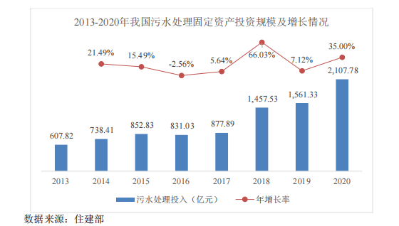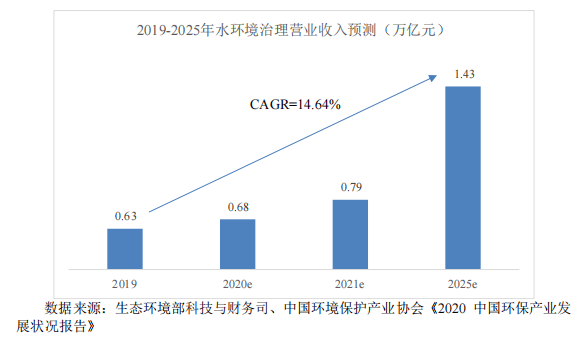 根据生态环境部科技与财务司、中国环境保护产业协会发布的《2020 中国环保产业发展状况报告》发布的数据,若按照“产业增长率”模型进行预测,2020年、2021 年和 2025 年我国环保产业营业收入将分别达到 1.93 万亿、2.24 万亿和4.04 万亿,依据 2019 年水环境治理行业重点企业收入占环保产业总体 35.37%的比例进行测算,水环境治理行业在未来对应年份的收入将分别达到 0.68 万亿、0.79 万亿和 1.43 万亿,2019-2025 年复合增长率约为 14.64%。