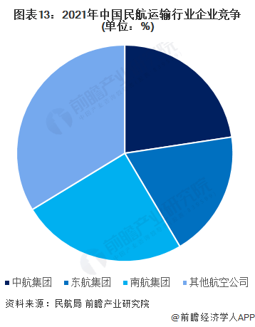 从企业竞争角度来看,由于民用航空运输行业高昂的资金壁垒,因此国内有实力的民航运输企业多为国有类型,其中以中航、南航和东航三大航司的实力最强。2021年全年,我国三大航空公司中航、东航和南航共计完成运输总周转量567.95亿吨公里,占比66.29%。其中,完成旅客运输量2.65亿人次,完成货邮吞吐量466.05万吨。